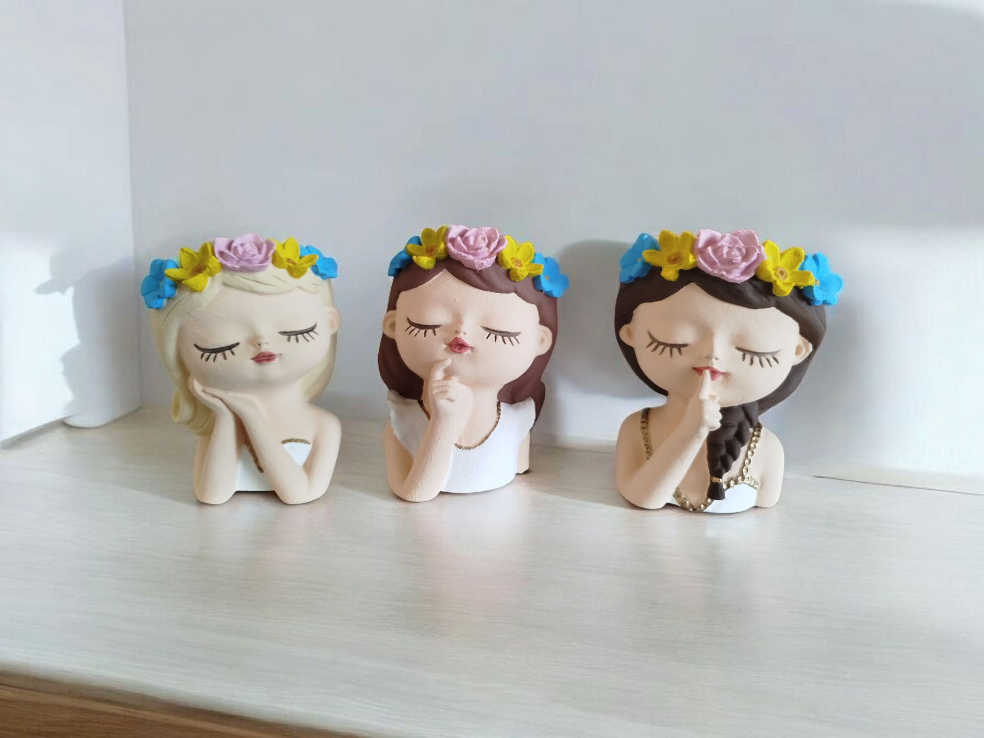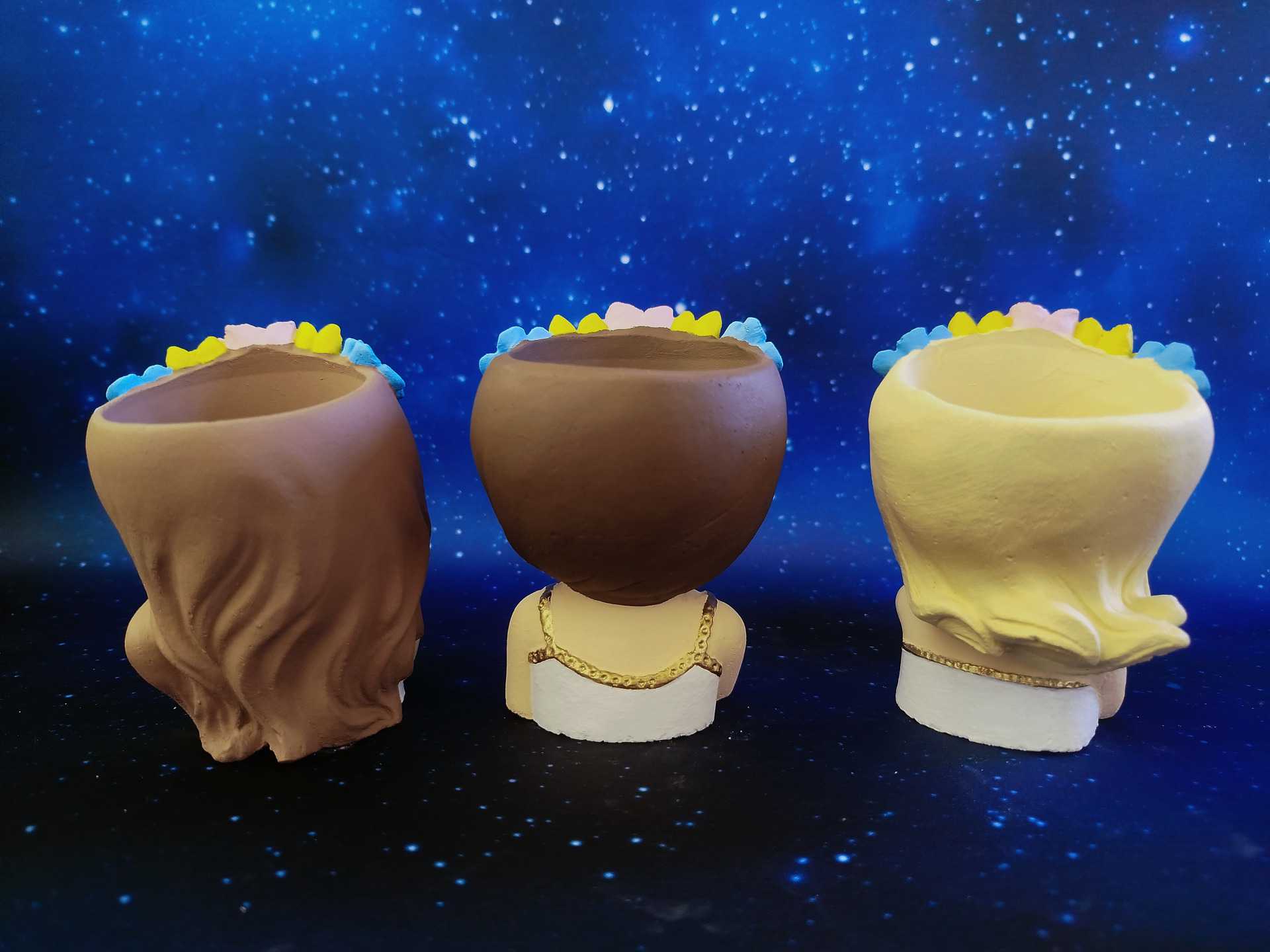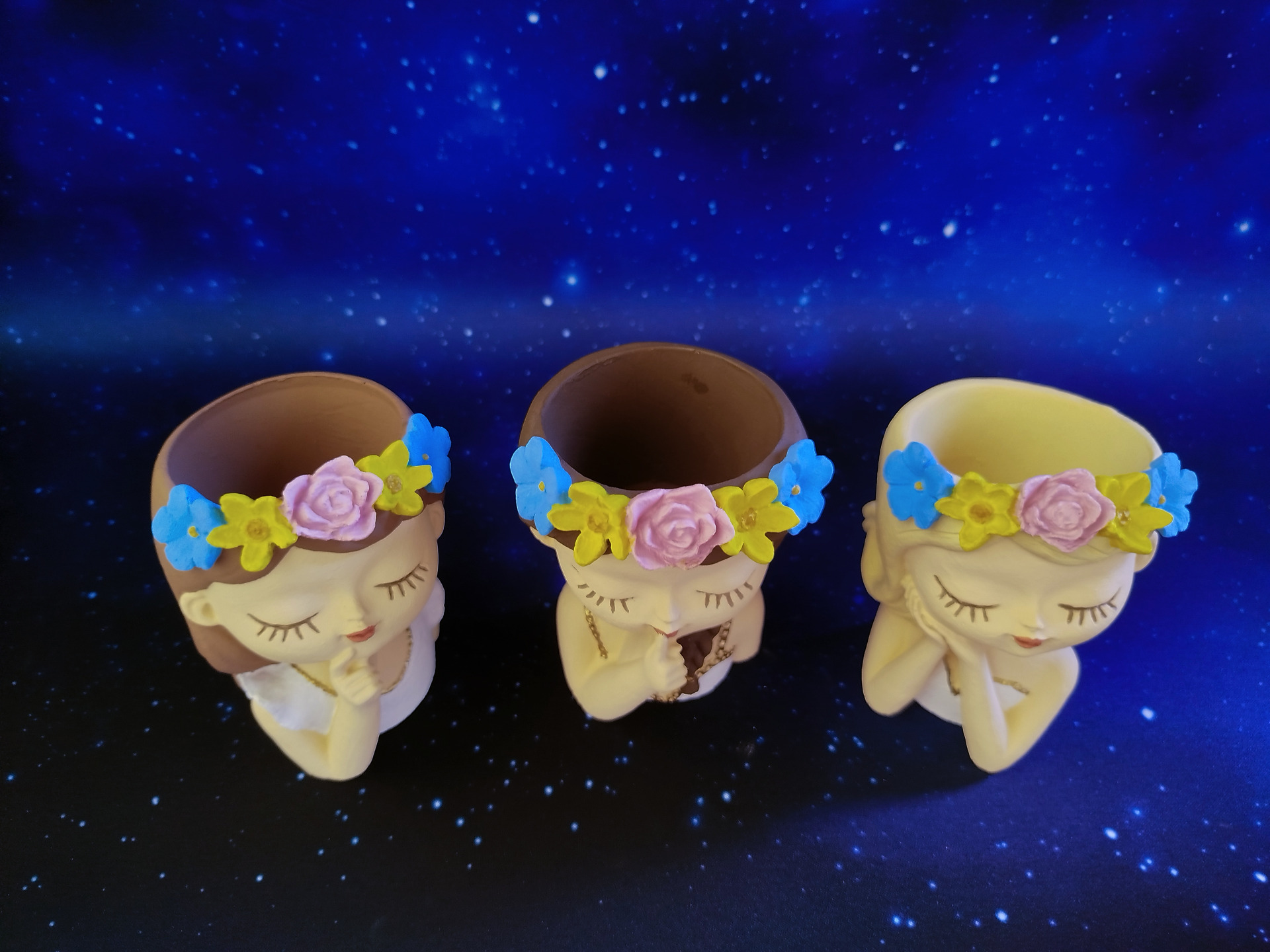 Betonová, ručně odlévaná a malovaná sada malých květináčků v designu "víly". Nabízíme také jednotlivě. Květináček, kromě s klasickou malou rostlinkou vypadá skvěle i se svíčkou, sukulenty, nebo třeba sušenými rostlinami. V nabídce také čistá betonová varianta. Ideální do interiéru.