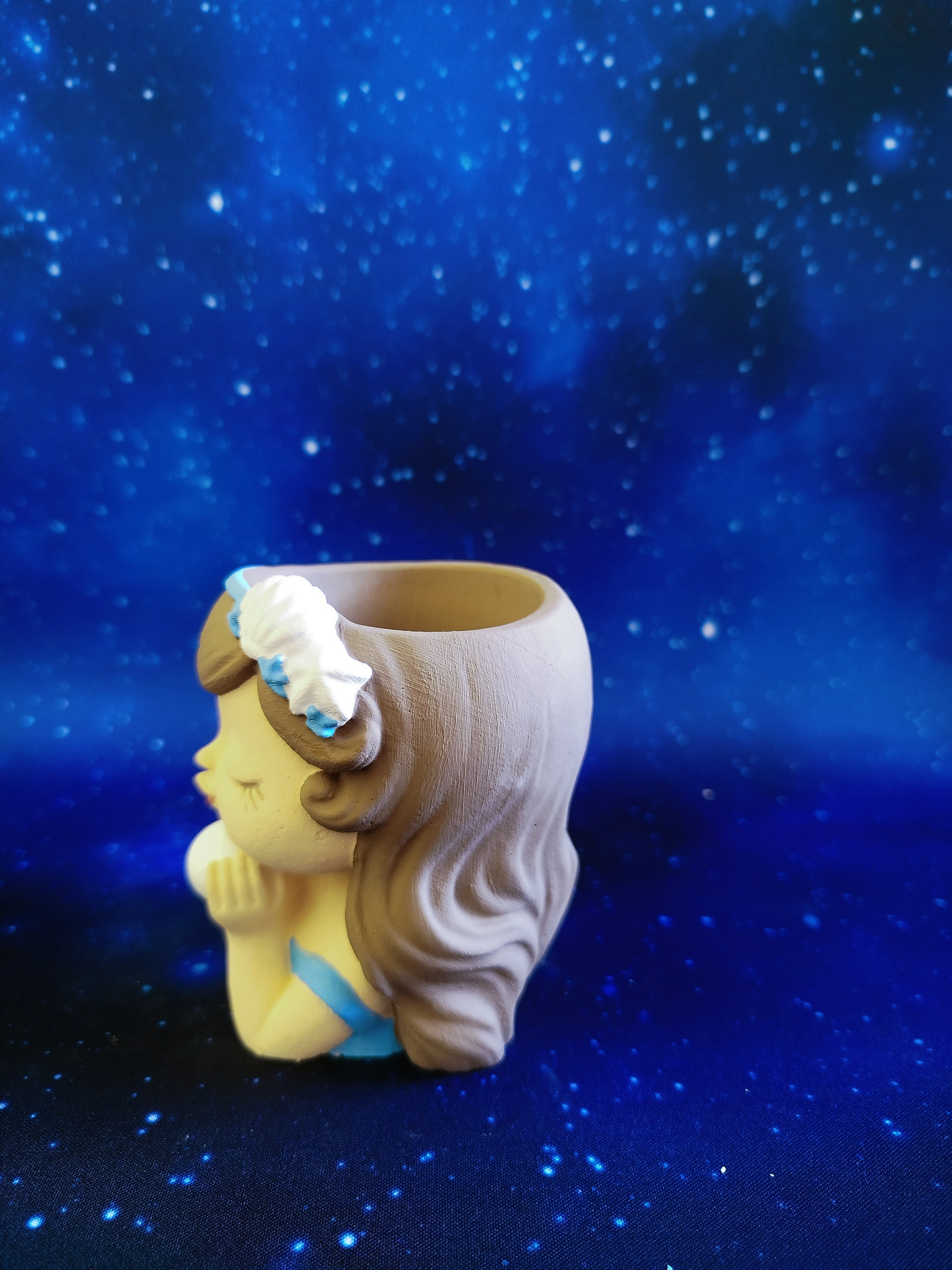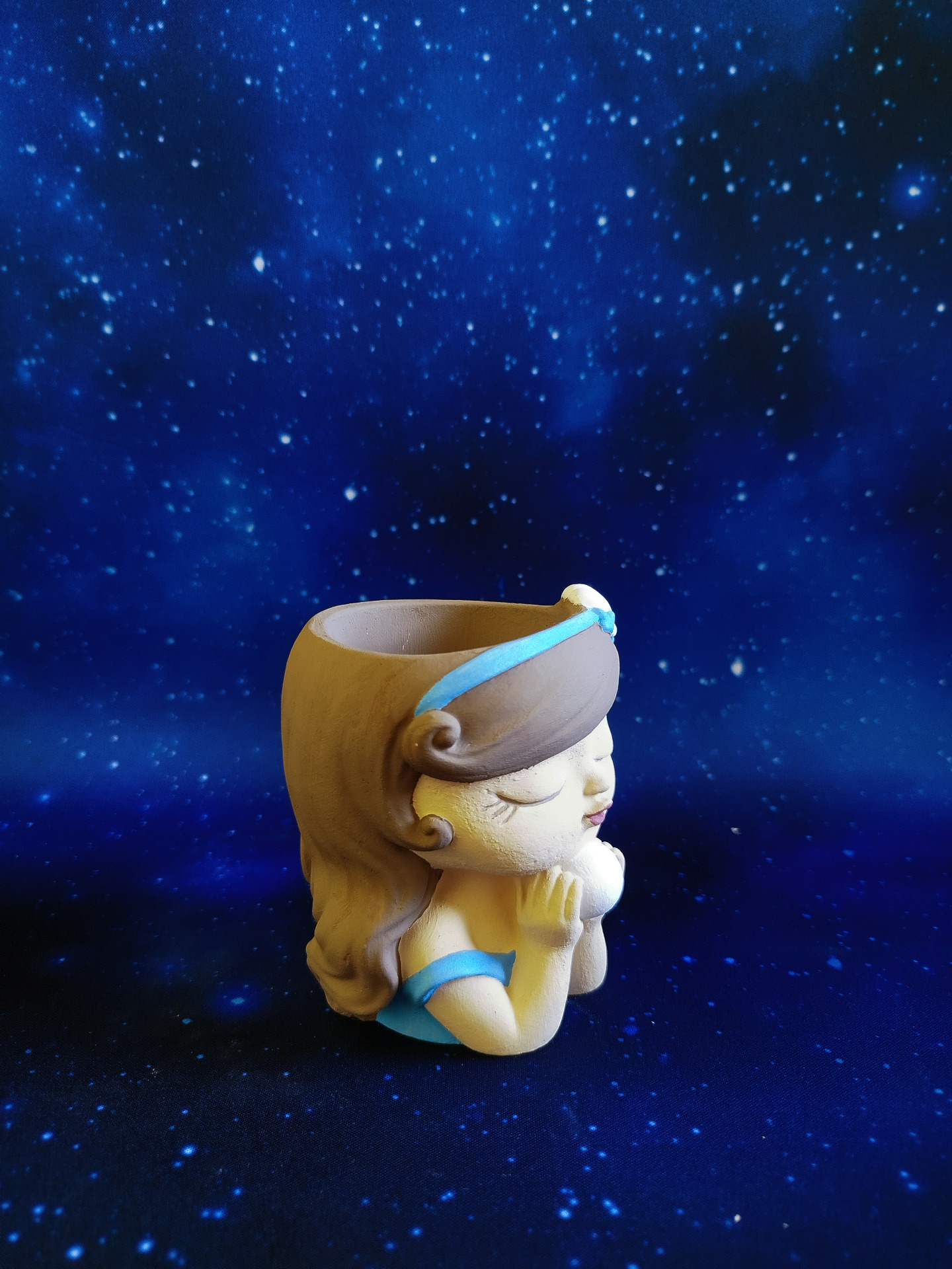 Betonový, ručně odlévaný a malovaný květináček v designu "víly". Decentní zlatá barva používaná na náhrobky se vyznačuje vysokou odolností a barevnou stálostí. Nabízíme také jako sadu 4 malých nemalovaných víl a nebo pouze v bílém provedení bez zlaté dekorace. Květináč, kromě s klasickou malou rostlinkou vypadá skvěle i se svíčkou, sukulenty, nebo třeba sušenými rostlinami.