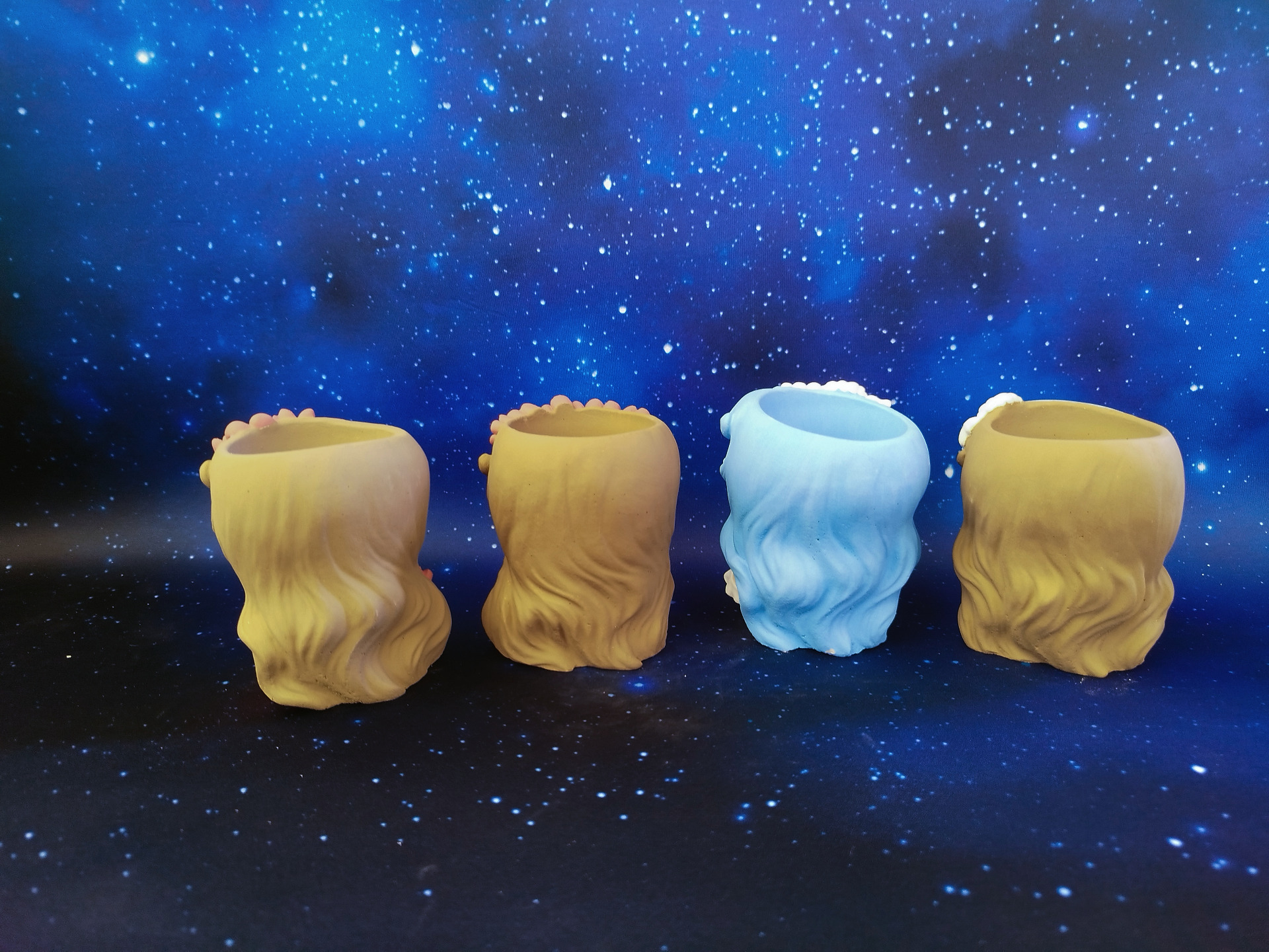 Betonová, ručně odlévaná a malovaná sada malých květináčků v designu "víly".