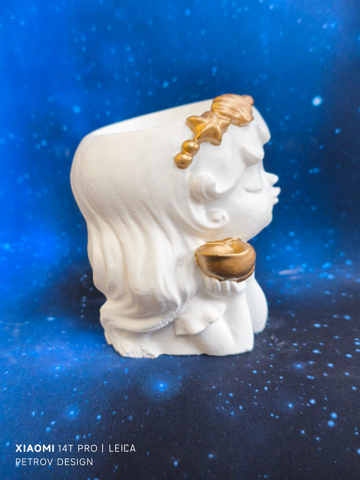 Betonový, ručně odlévaný a malovaný květináček v designu "víly". Decentní zlatá barva používaná na náhrobky se vyznačuje vysokou odolností a barevnou stálostí. Nabízíme také jako