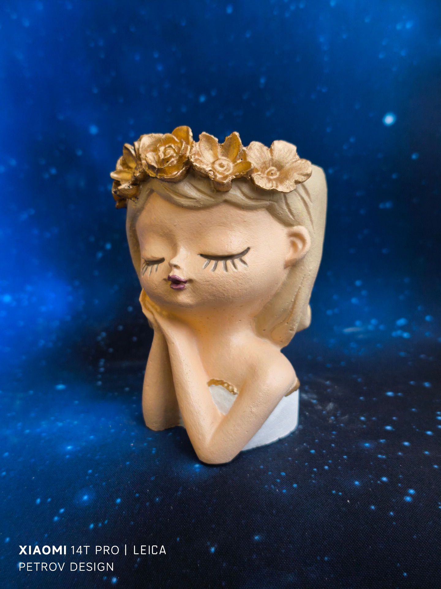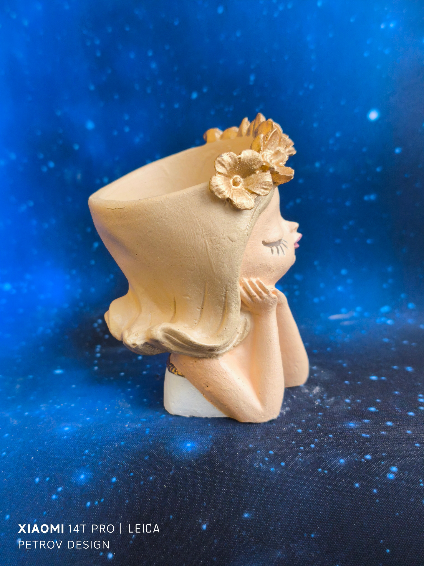 Betonový, ručně odlévaný a malovaný květináček v designu "víly". Květináček, kromě s klasickou malou rostlinkou vypadá skvěle i se svíčkou, sukulenty, nebo třeba sušenými rostlinami. V nabídce také čistá betonová varianta. Ideální do interiéru.